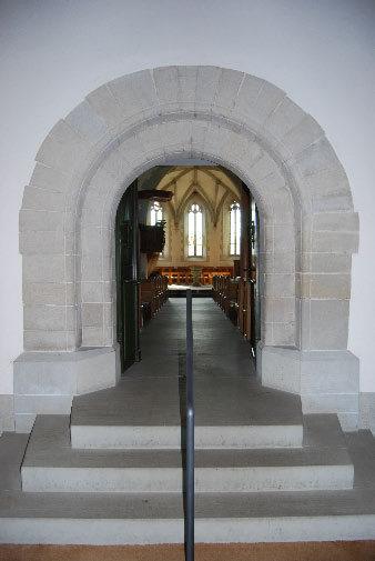 Vorzeichen: Blick durch das romanische Hauptportal ins Kirchenschiff. Das Portal gehört zur ältesten Bausubstanz der ehemaligen romanischen Basilika aus dem 10. Jh.