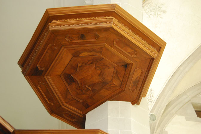 Kanzel: Der Schalldeckel wurde erst 1749 angefertigt. Untersicht: Sternmotiv. Inschrift auf der Oberseite: "JOH HENRICUS LAVATERUS parochus: Etatis 55".