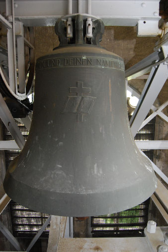 Zweites Glockengeschoss: Betzeitglocke (Gewicht: 800 kg; Stimmung: fis; Symbol: Aufgeschlagene Bibel mit Kreuz; Spruch: "Ich will dich täglich loben und deinen Namen rühmen immer und ewiglich."; gestiftet von Familie Müller, Schloss Gachnang; Verwendung: Viertelschlag und Betzeitläuten)