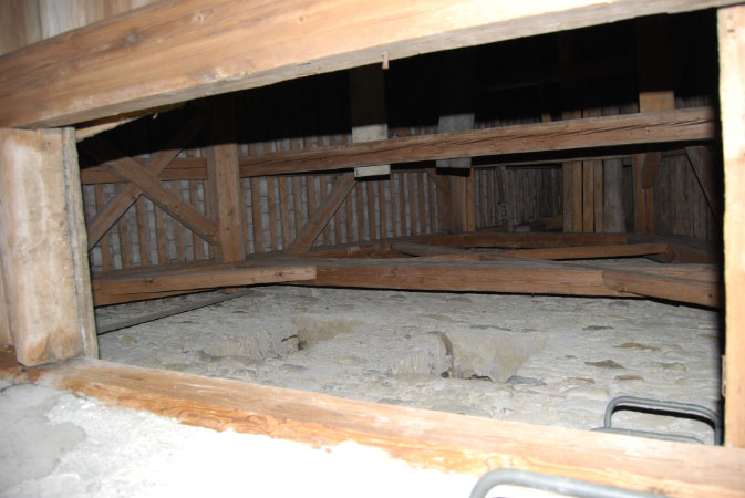 Glockenstube: Eingangsluke auf den Turmdachboden mit Blick durch die drei Dachgeschosse bis zum Dachfirst ◄ Back Next ► Picture 53 of 108 Glockenstube: Eingangsluke auf den Turmdachboden mit Blick durch die drei Dachgeschosse bis zum Dachfirst