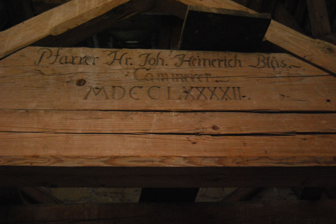Turmdachboden: erstes Dachbodengeschoss mit Inschrift auf einem der Querbalken: "Pfarrer Hr. Joh. Heinerich Blas - Cammerer - MDCCLXXXXII" (1792) ◄ Back Next ► Picture 56 of 108 Turmdachboden: erstes Dachbodengeschoss mit Inschrift auf einem der Querbalken: "Pfarrer Hr. Joh. Heinerich Blas - Cammerer - MDCCLXXXXII" (1792)