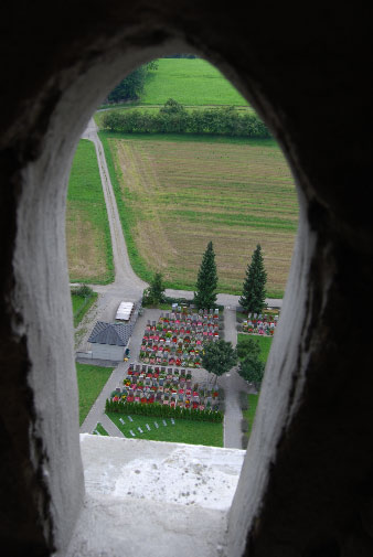 Turmdachstuhl: Ausblick auf den Erdbestattungsfriedhof aus dem obersten Giebelfenster im dritten Turmdachgeschoss ◄ Back Next ► Picture 63 of 108 Turmdachstuhl: Ausblick auf den Erdbestattungsfriedhof aus dem obersten Giebelfenster im dritten Turmdachgeschoss