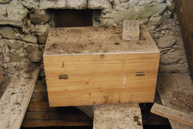 Turmdachstuhl: Vogelkiste vor dem nördlichen Giebelfenster des Turmdaches ◄ Back Next ► Picture 66 of 108 Turmdachstuhl: Vogelkiste vor dem nördlichen Giebelfenster des Turmdaches