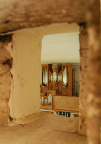 Wendeltreppe: Blick aus der oberen Fensterluke über das Kirchenschiff auf die Empore ◄ Back Next ► Picture 85 of 108 Wendeltreppe: Blick aus der oberen Fensterluke über das Kirchenschiff auf die Empore