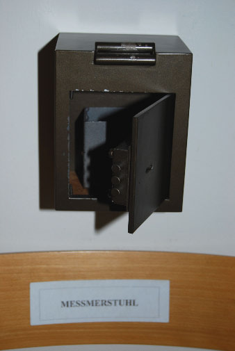 Kirchenschiff: Kollektenkasten neben dem Ausgangsportal. Die Kollektenkästen werden nach jedem Gottesdienst geleert und offen gelassen. Es gibt also nichts zu holen...
